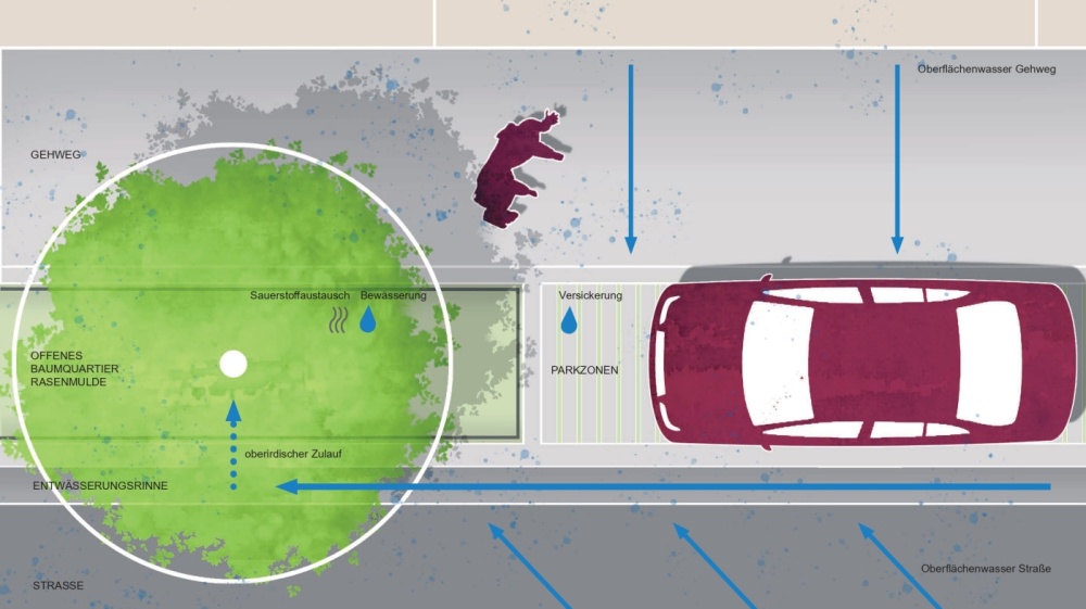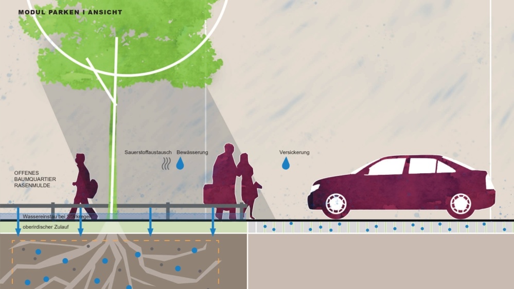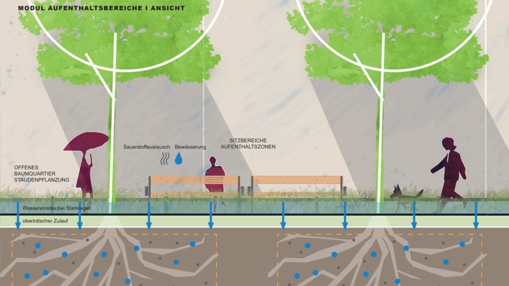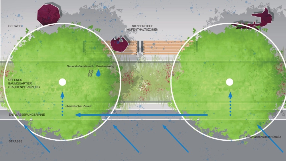 Bei der Umgestaltung des Straßenraums und den Planungen der Grünelemente achten wir daher besonders darauf, dass der Niederschlag, der sich auf Gehwegen und im Straßenbereich sammelt, nicht über Rinnen und Abläufe in den Kanal geführt, sondern direkt in die Baumscheiben und Beete eingeleitet wird.